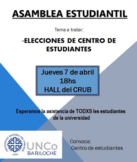 El Centro de Estudiantes de la UNCo Bariloche convoca a Asamblea Estudiantil este jueves 7 de abril a las 18 hs en el hall del CRUB.