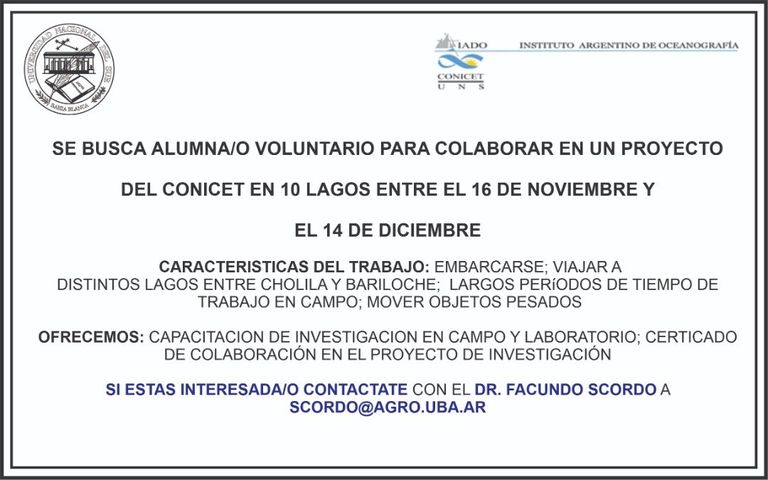 Búsqueda de estudiante voluntario/a – Proyecto del Instituto Argentino de Oceanografía CONICET Proyecto de investigación a desarrollarse en 10 lagos de la Patagonia entre el 15 de Noviembre y el 15 de Diciembre del 2022. https://web.crub.uncoma.edu.ar/wp-content/uploads/2022/09/307933635_106856988787755_5617633923234744893_n.jpg