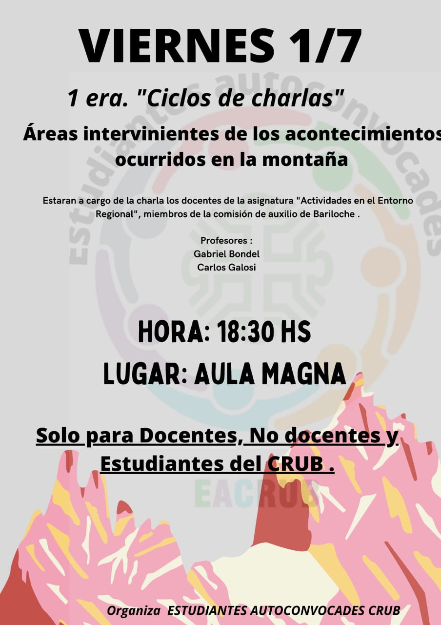 Charla: Áreas intervinientes de los acontecimientos ocurridos en la montaña Viernes 1/7Aula Magna – 18.30 hs. https://web.crub.uncoma.edu.ar/wp-content/uploads/2022/06/WhatsApp-Image-2022-06-28-at-1.46.33-PM.jpeg