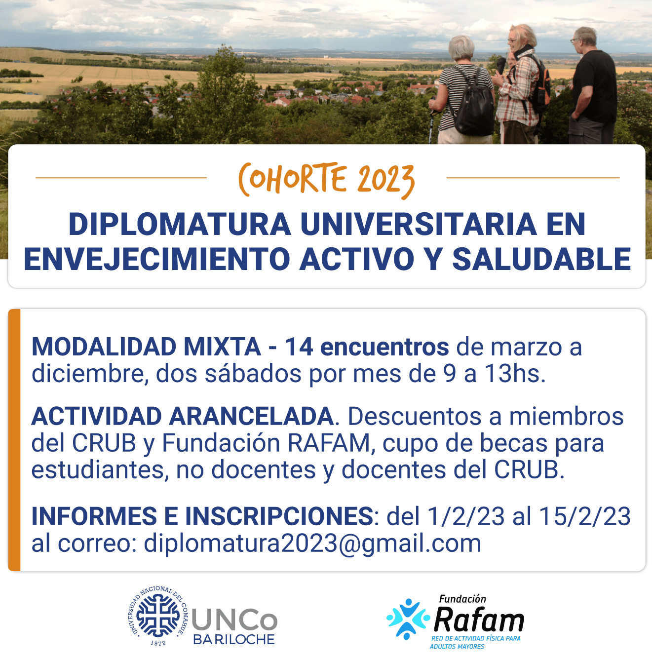 Desde el 1° de febrero está abierta la inscripción para la Diplomatura en Envejecimiento Activo y Saludable, desarrollada en conjunto entre la Universidad Nacional del Comahue y la Fundación RAFAM.