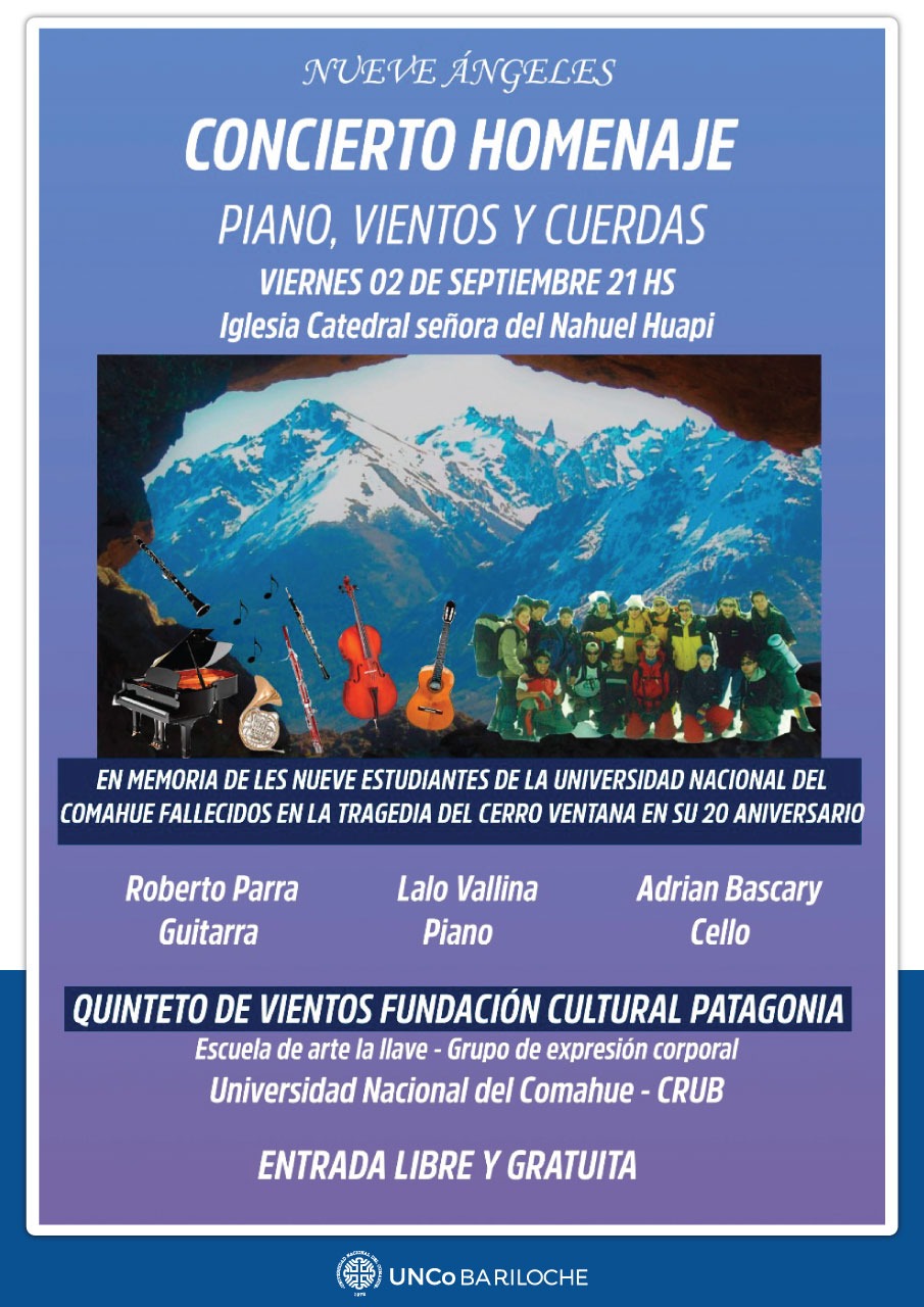 Este viernes 2 de septiembre a las 21 horas, se realizará un concierto en la Iglesia Catedral Nuestra Señora del Nahuel Huapi, en el marco de las actividades por el 20° aniversario de la tragedia del cerro Ventana