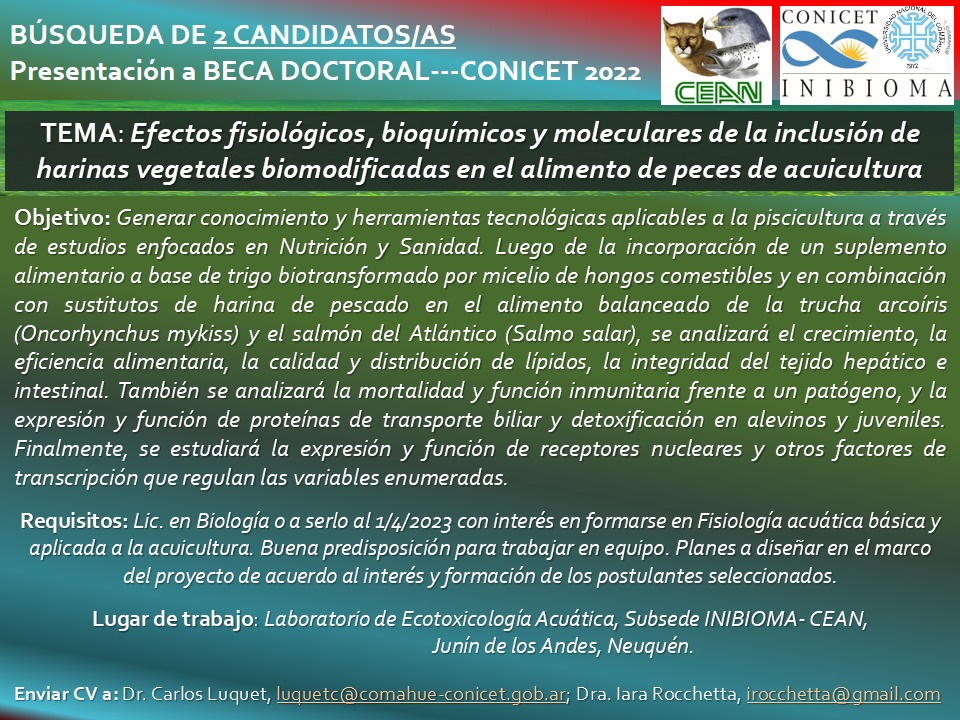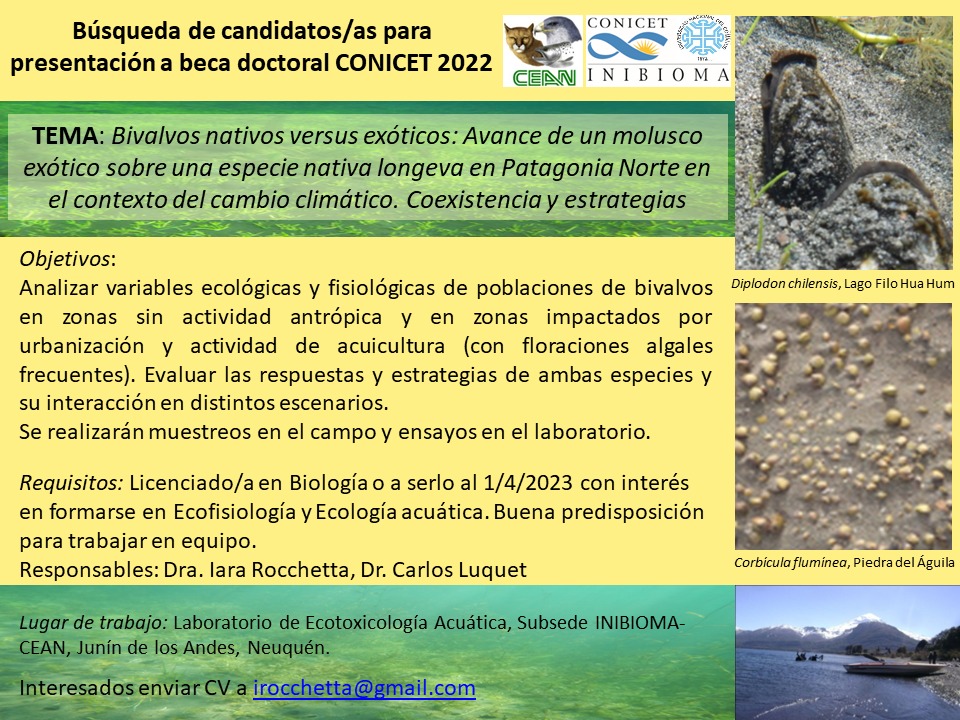 Lugar de trabajo: Laboratorio de Ecotoxicoligia Acuatica, Subsede INIBIOMA-CEAN, Junín de los Andes, Neuquén.Interesados/as enviar CV a irocchetta@gmail.com