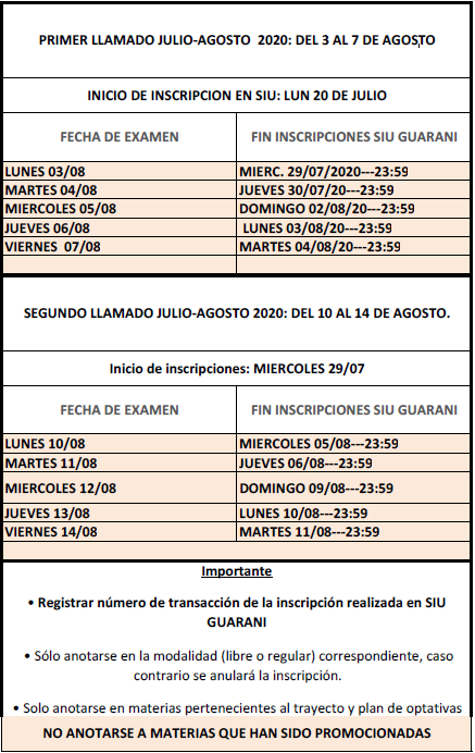 Plazos para la inscripción a exámenes. Llamado julio-agosto