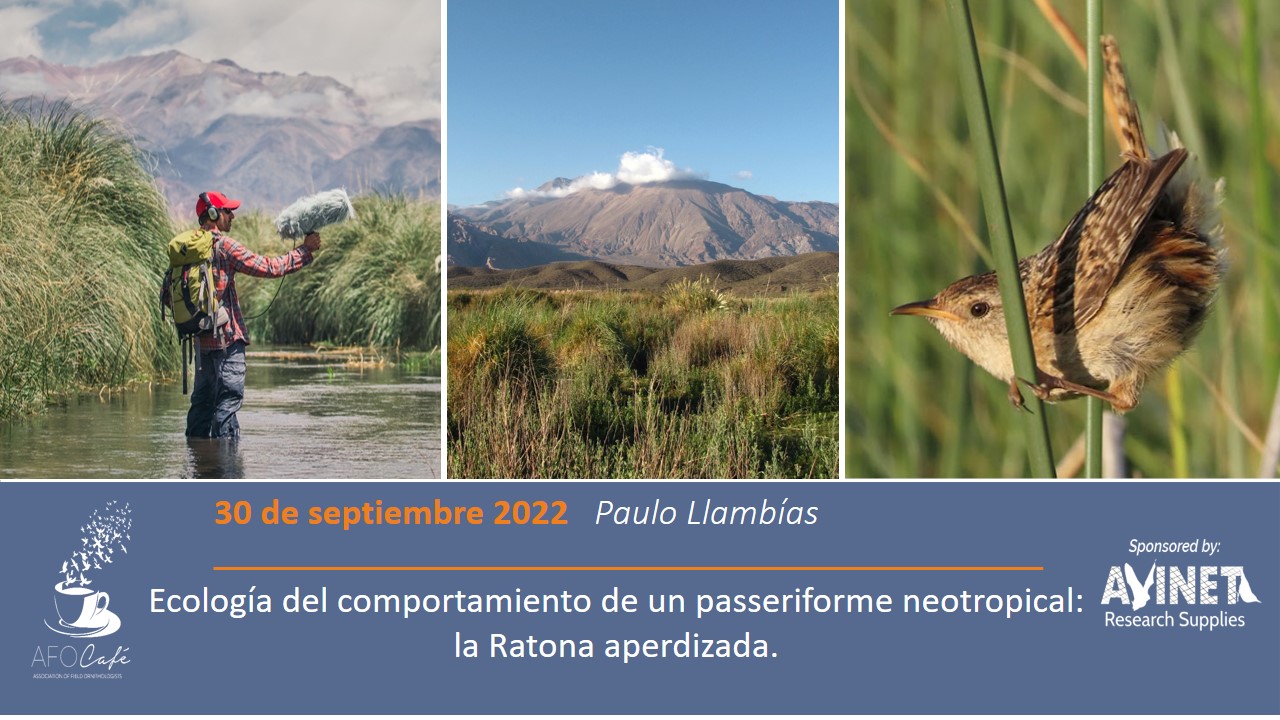 El Comité de comunicación de la Association of Field Ornithologists invitan a toda la comunidad de la Universidad del Comahue a participar del próximo AFO-café este viernes 30 de septiembre a las 17:00 (16:00 EST) donde participará el Dr Paulo Llambías (IADIZA), presentando “Ecología del comportamiento de un passerino neotropical: la Ratona aperdizada”. La charla es abierta al público e interactiva. Se dará en inglés pero se podrán hacer preguntas en español.