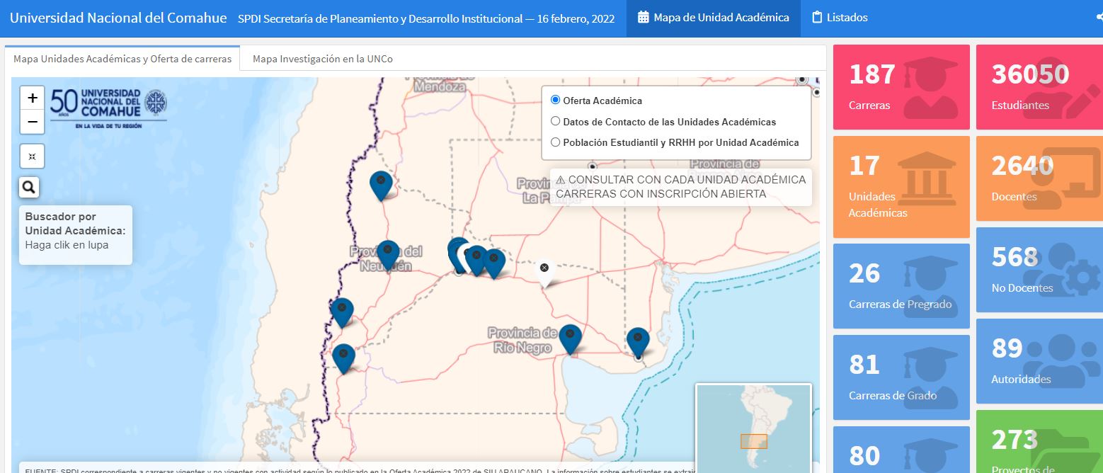 La Secretaría de Planeamiento y Desarrollo Institucional presenta el Mapa Web de la UNCo, donde se podrá visualizar información sobre la actividad académica y de investigación que lleva adelante nuestra universidad en los distintos puntos del territorio.