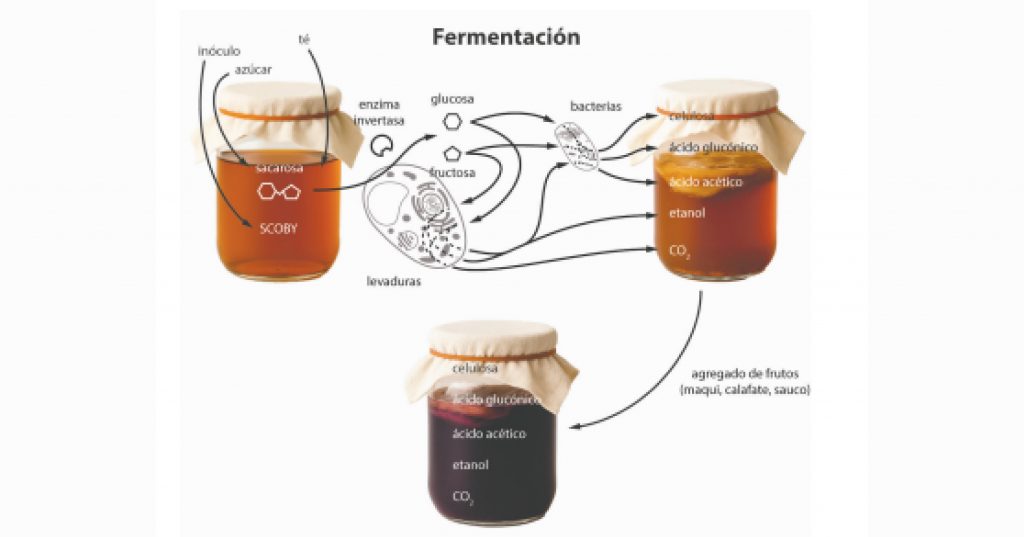 El té de kombucha es un té negro azucarado que se diferencia de los tés más generalmente conocidos, porque se produce a través de la fermentación producida en asociación simbiótica con bacterias y levaduras. La fermentación del te de kombucha dura aproximadamente 14 días donde al finalizar podemos observar, una película de celulosa en superficie y un caldo de cultivo negro bajo la misma. Una segunda fermentación adiciona sabores y aromas que producen un valor adicional al para su venta y consumo. No obstante, los efectos de la segunda fermentación sobre los compuestos antes descritos, así como también, la incidencia de la segunda fermentación en la producción de metabolitos nuevos, no ha sido objeto de investigaciones. Productores en Patagonia han volcado sus esfuerzos en la producción del te de Kombucha con plantas de interés regional y con algunas que son conocidas como “plantas medicinales de la región patagónica”. En este sentido se despierta un interés agregado para conocer cuál es la incidencia de estos tipos de plantas en la generación de nuevos compuestos y en la estabilidad de los metabolitos existentes, lo que hace se sumen nuevos interrogantes a la hora de analizar este tipo de bebida.