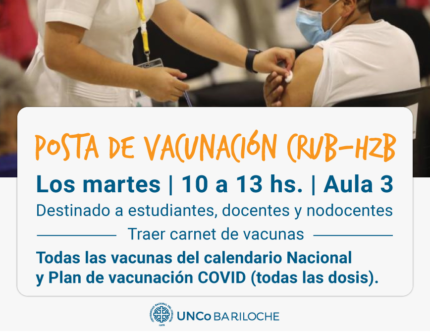 La posta, organizada en conjunto con el Hospital Zonal Bariloche, funcionará los martes de 10 a 13hs. en el Aula 3 y está destinada a estudiantes, docentes, nodocentes, investigadores/as y personal de apoyo de los Institutos UNCo-CONICET que deban iniciar o completar su esquema de vacunación.