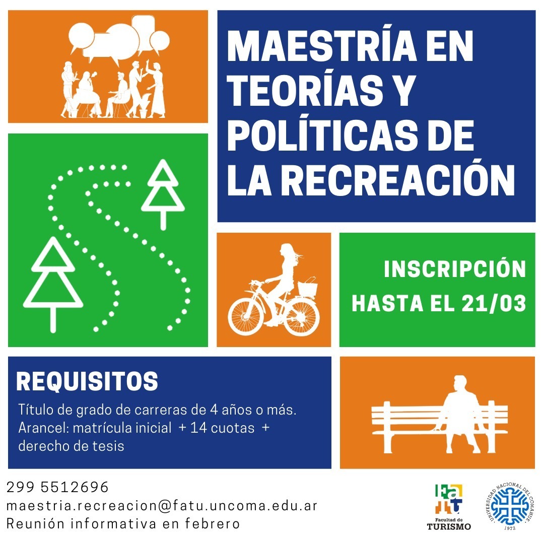 Por más consultas escribir maestria.recreacion@fatu.uncoma.edu.ar – Para más Información comunicarse con el Departamento de posgrado: posgrado@fatu.uncoma.edu.ar