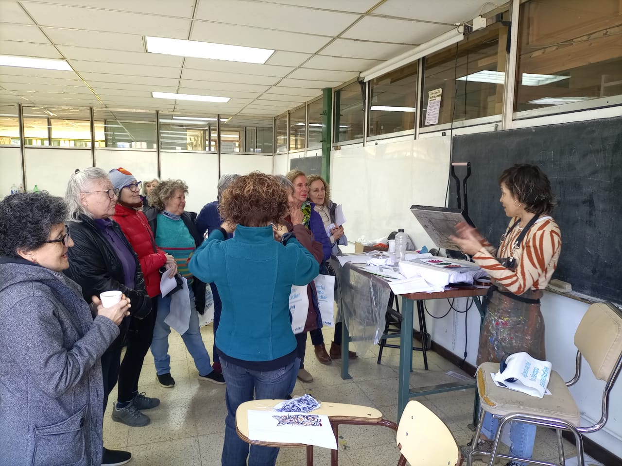Los chicos y las chicas del Qmark, junto a la profesora Verónica Goncalvez, enseñaron durante este encuentro la técnica de sublimación en telas a las estudiantes de UPAMI.